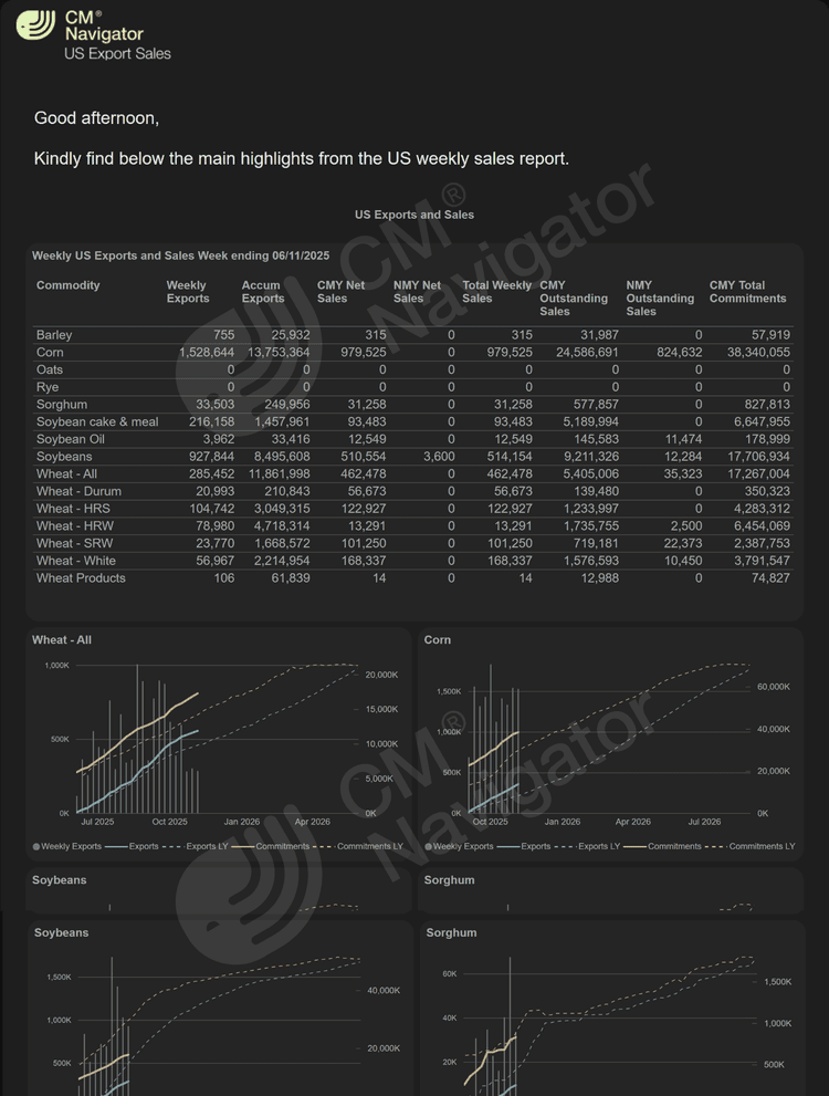 Track weekly U.S. agricultural export sales data, focusing on volumes, destinations, and short-term demand signals in grain markets.